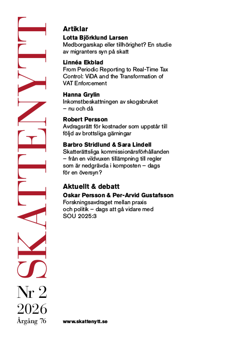 SkatteNytt är en av Sveriges ledande tidskrifter på skatterättens område och har så varit i över sjuttio år. Artiklarna i SkatteNytt täcker hela det skatterättsliga fältet som företagsbeskattning, internationell skatterätt, individbeskattning, mervärdesskatt, punktskatter, skatteprocessrätt och EU-skatterätt.